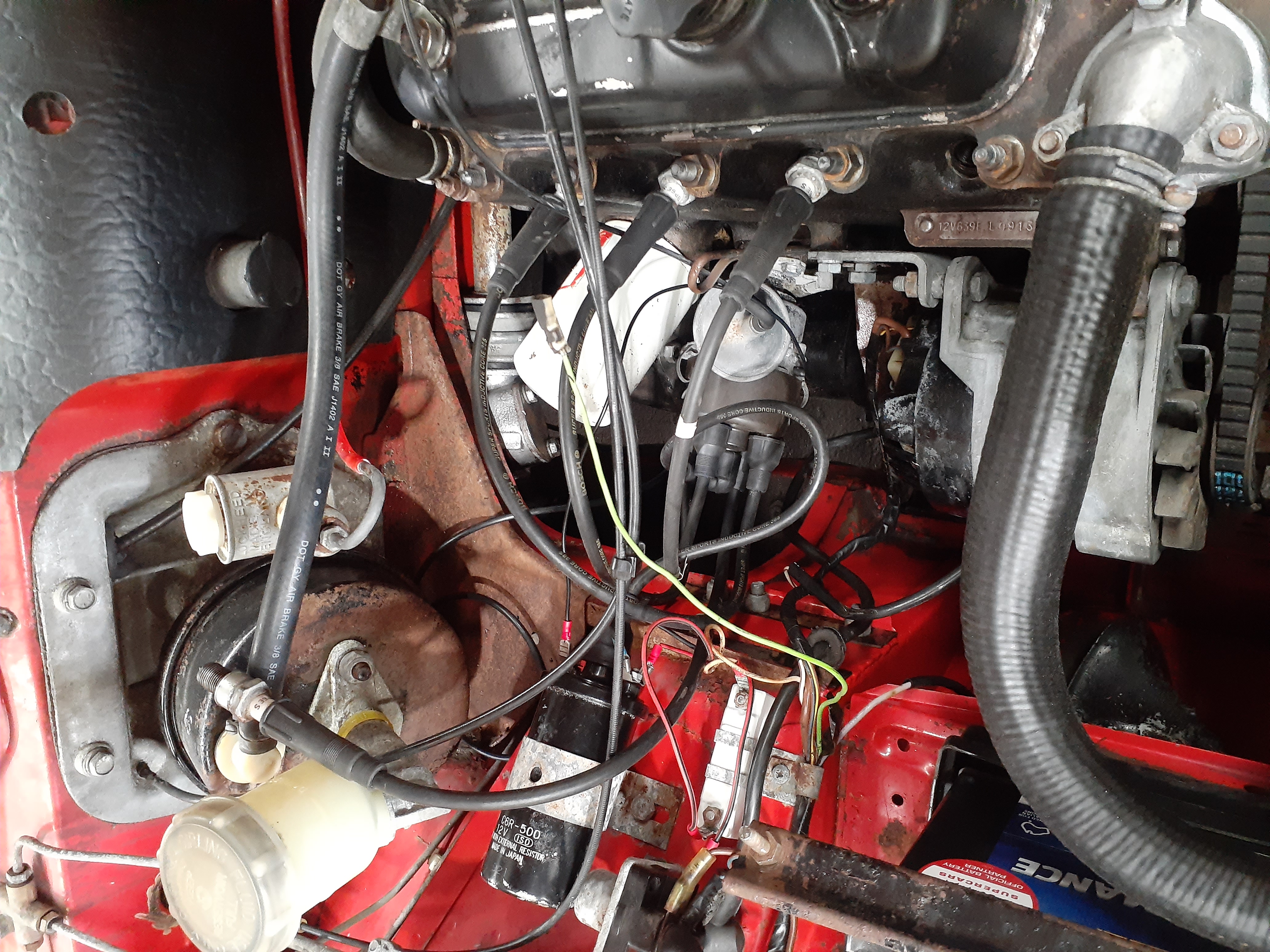 It should go on sender at front of cylinder head then. The ignition coil is incorrect as its a 12 volt coil. you either need to remove the ballast resistor connecting the white wire directly to coil positive ( assuming negative earth) disconnecting the red black wire and the other wire on the coil cant quite see colour from picture the other side of coil negative to distributor points the red black wire should also be removed from the brown wire on solenoid