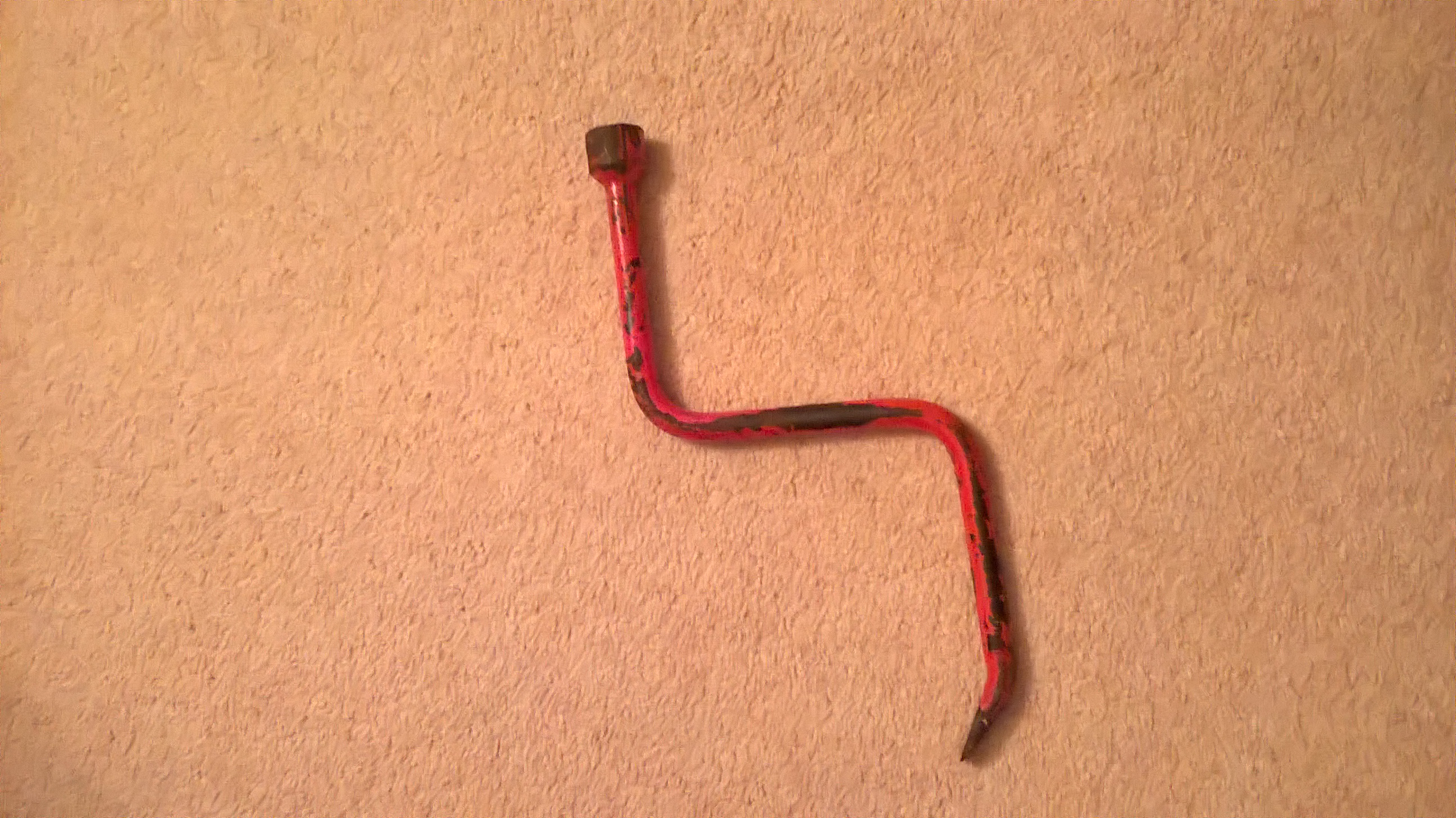The bent wheel studs I tweaked more-or-less straight by putting a nut on the offending stud, and gently massaging it with my long wheel wrench. I'd also got an engineer's square to check them. Unlikely to be perfect, there were a number of bent studs on all four corners of the car, and they are now a lot better than they were. I believe the culprit for the bent studs, combined with the long chromed (but rusty) domed wheel nuts on my wheels, is this thing I found in the boot - Now correct me if I'm wrong, but that's not a Marina part, is it? Looks more like a Mini wheel brace to me. It's easy to yank the wheel studs out of shape with that thing. It's not in my boot now. I've got a ratchet and socket instead for the time being. It never ceases to amaze me how many cars get separated from their original jack and wheel brace and end up with inferior substitutes. Mind you, my Volvo C30 wheel brace split, because it was made of Belgian chocolate instead of real metal....