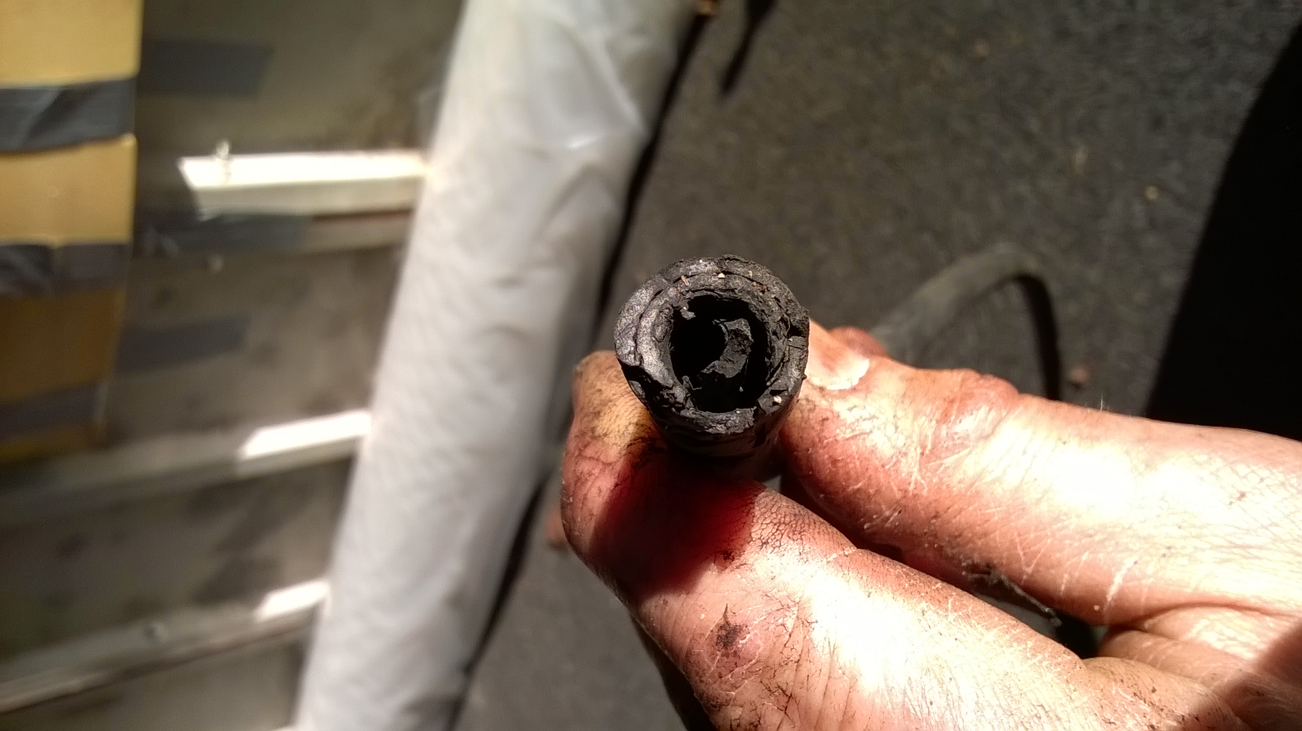 I assume this petrol pipe I replaced on Saturday wasn't ethanol resistant. The short piece running from the fuel tank, which I took to be original because of the wire clips and disintegrating fabric outer braid, was a bit stiff to remove but the bore was fine. This pipe in the photo, running from the middle of the floor to the fuel pump, and secured by jubilee clips, is delaminating. Who'd have thought original BL rubber pipe was tougher than later aftermarket stuff?