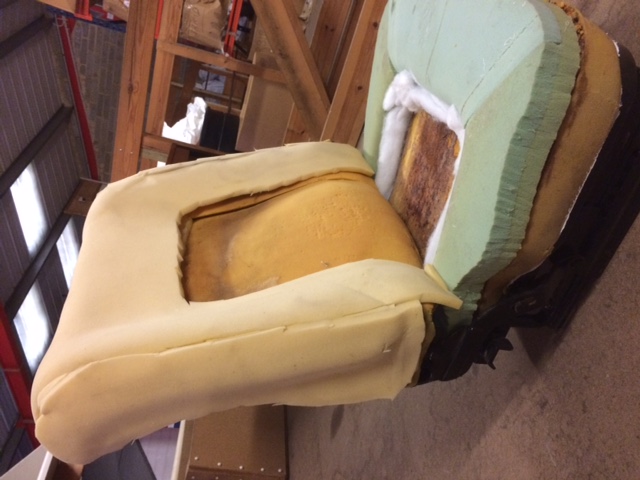 After much collecting of pieces of interior from all three corners of the uk I have delivered them to the upholsterers. Attached are couple of pictures of the state of the seats after Gary's man had a go,quite a jigsaw of foam,and that blue with white piping,not to my taste.